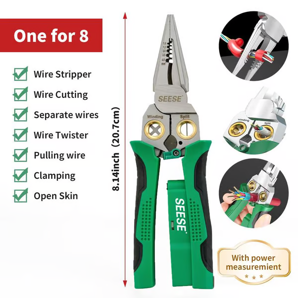 - Multifunktionell avbitartång och tvinnare med elmätningsfunktion för effektiv kapning, dragning, skrapning och pressning av tråd. Perfekt verktyg för elektriker och gör-det-själventusiaster