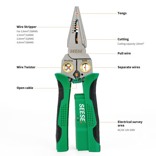 - 8-i-1 avbitartång med spänningstestfunktion som ger bekvämlighet och noggrannhet för elarbeten. Säg adjö till flera verktyg med denna allt-i-ett-lösning.lämplig för AWG 18,14,12,10,6/1,0,1,5,2,0,2,5,4,0mm²; Cape-kabel 25mm² Wire, öppen kabel ytterhud, dela ledningar 2 * 1,5mm²