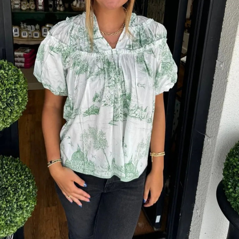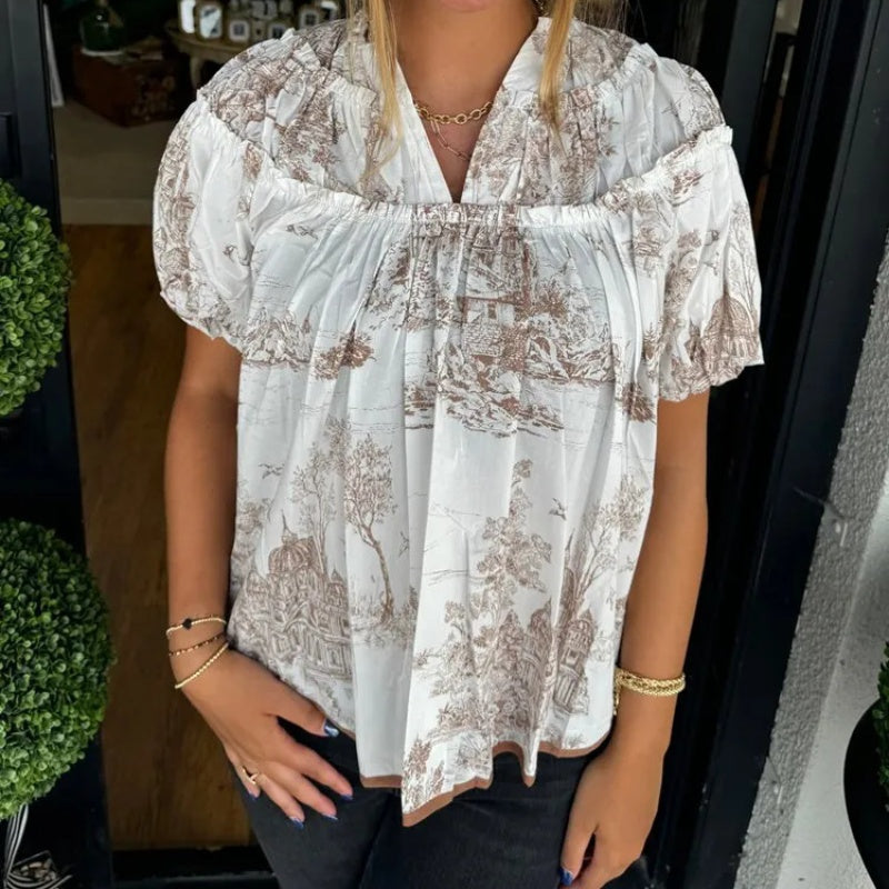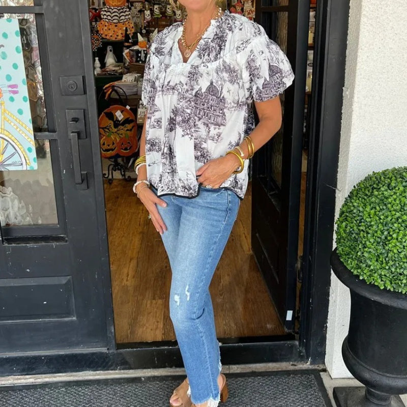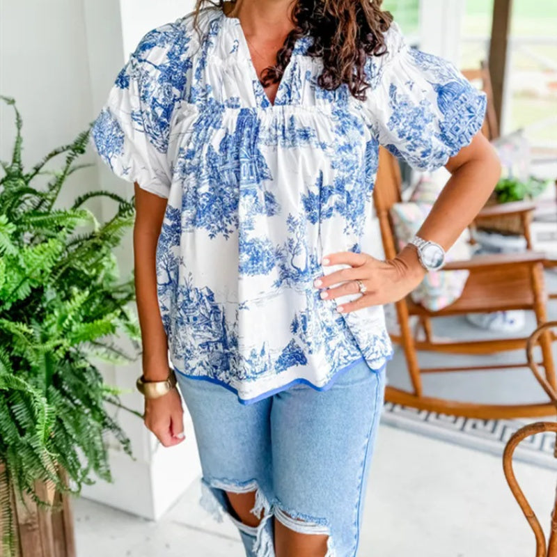 V-ringad blus med tryck för kvinnor