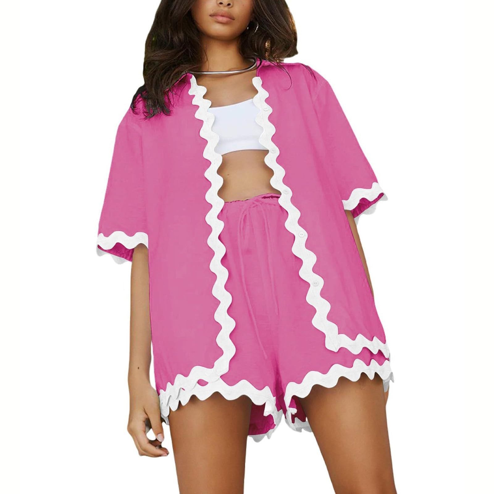 COASTAL CHIC DESIGN – Crisp white wave detailing trims the hem of this breezy cardigan-and-shorts set, blending nautical charm with modern minimalism. The lapel collar and short sleeves add polish, while Blue, Rose, or Navy hues evoke seaside serenity. Beach-to-street elegance, redefined.