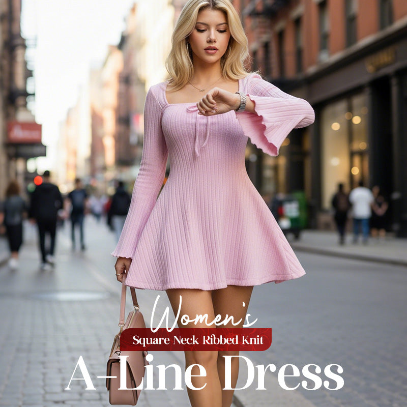 🔥Specialerbjudande: 49 % rabatt🔥 Damklänning med fyrkantig halsringning, ribbad stickning och A-linjeform